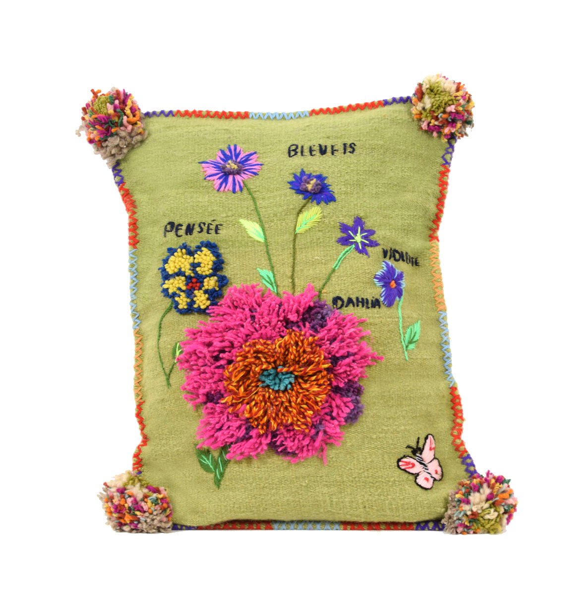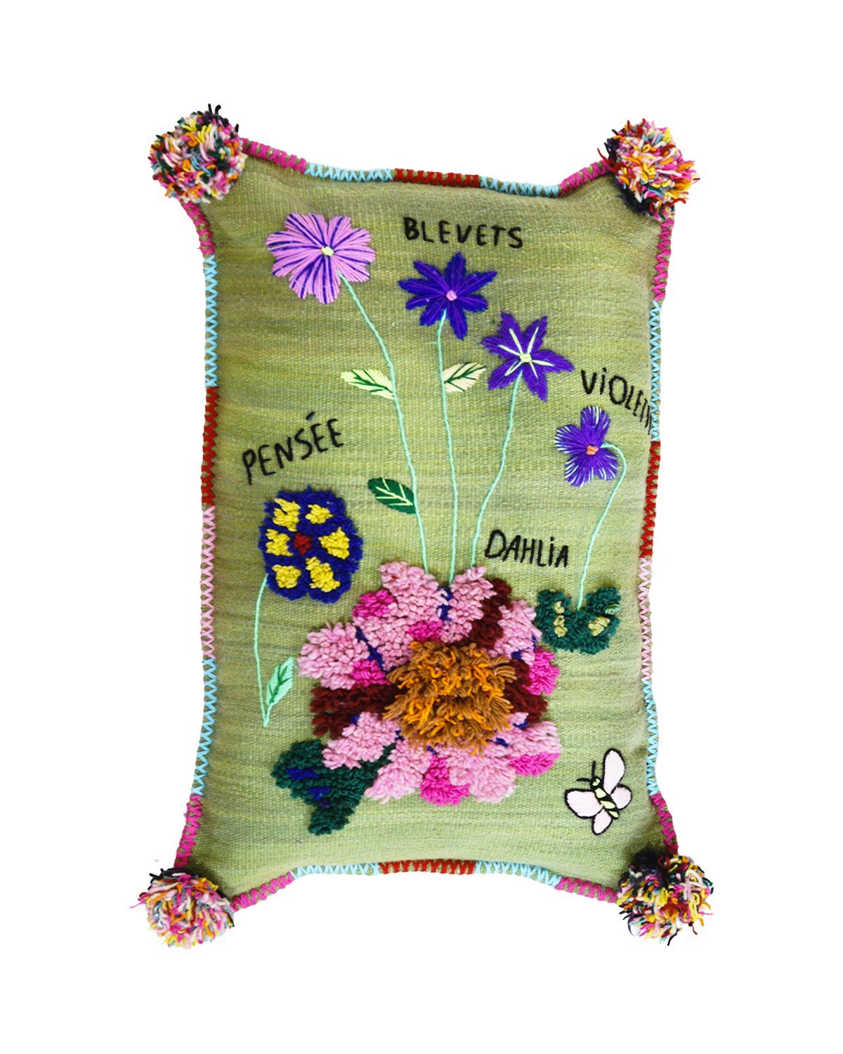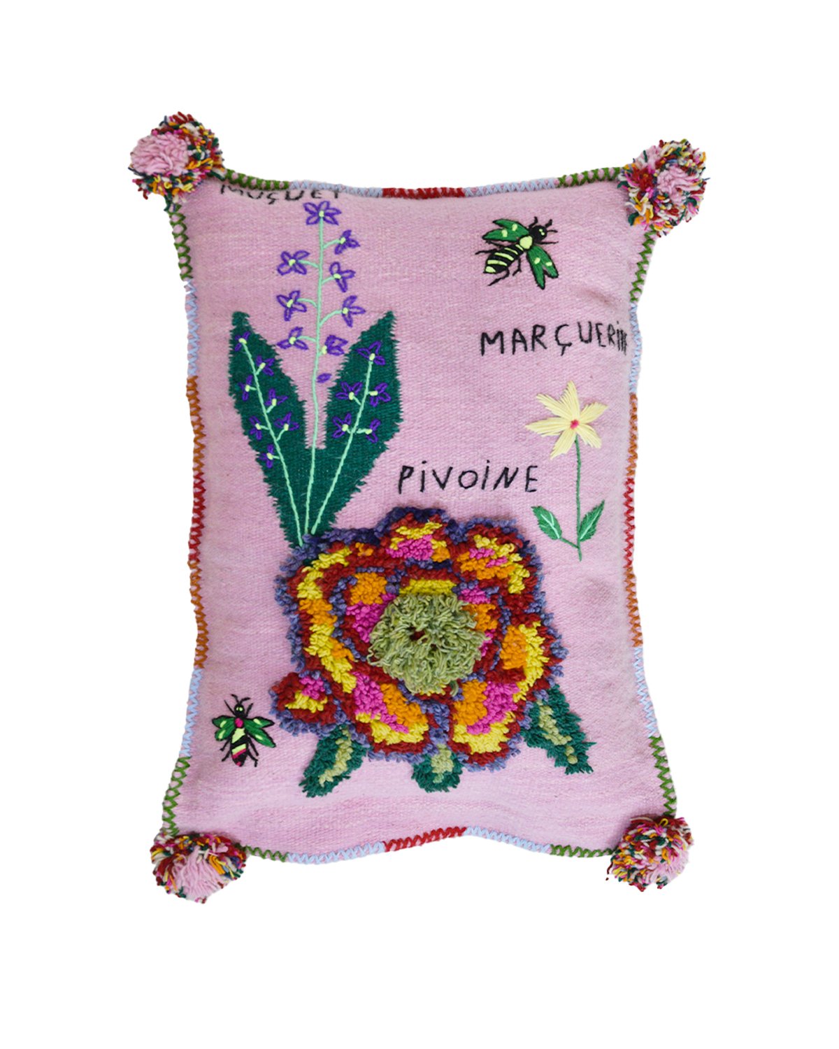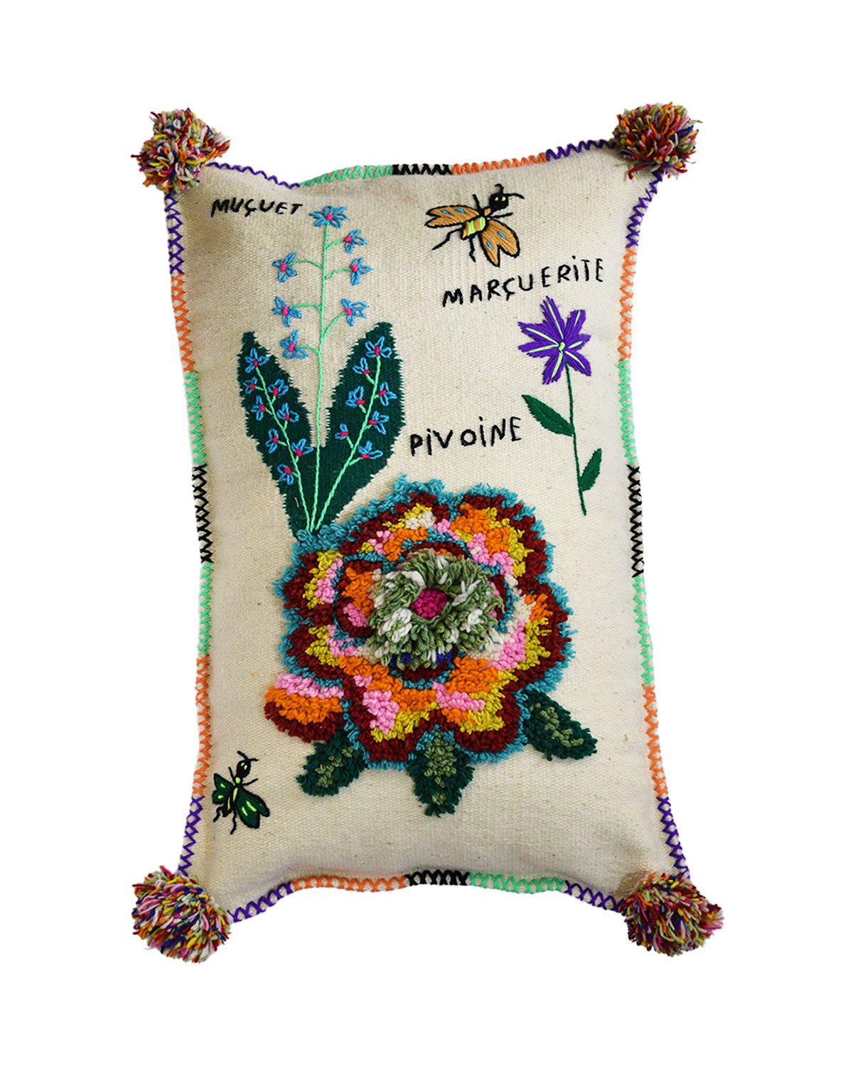 The Happy Gardener is a character from a herbarium illustrated by Nathalie Lété. The cushion covers are handwoven. The theme is knotted on a flat-woven base for added relief. They are perfect for decorating a sofa or bed.