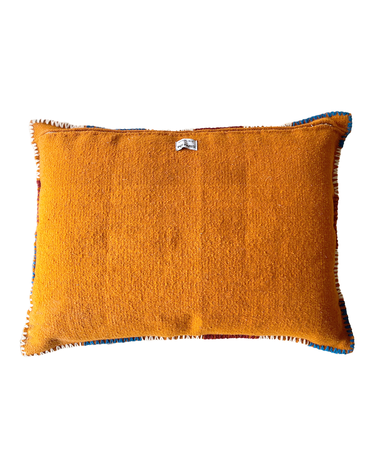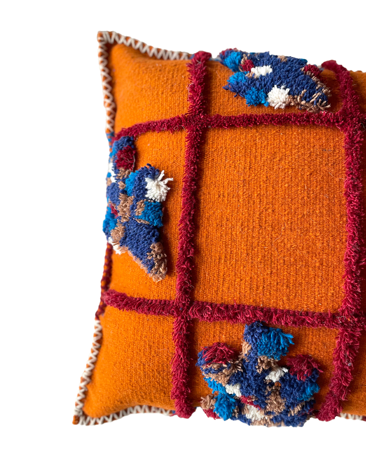 Hand-woven cushion covers featuring knotted motifs on a flat-weave base for added texture. Inspired by the enchanting world of artist Baya, these pieces celebrate traditional gestures and craftsmanship. The interplay of relief and artistic heritage ensures that every cover is a singular work of art.