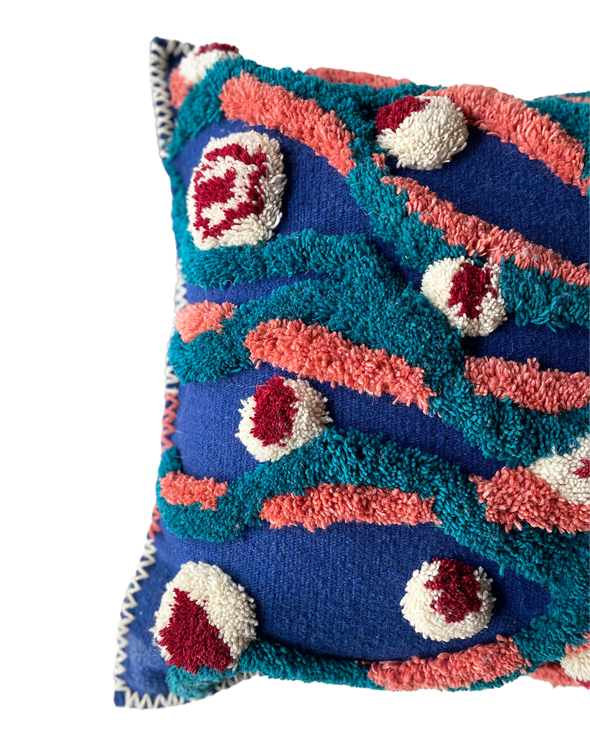 Hand-woven cushion covers featuring knotted motifs on a flat-weave base for added texture. Inspired by the enchanting world of artist Baya, these pieces celebrate traditional gestures and craftsmanship. The interplay of relief and artistic heritage ensures that every cover is a singular work of art.