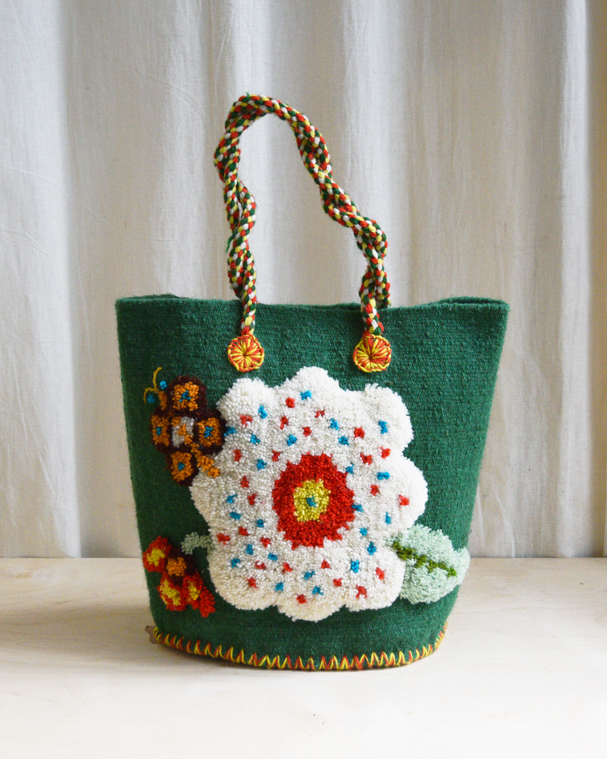 Handwoven wool basket featuring Nathalie Lété's flower and butterfly theme in raised relief.