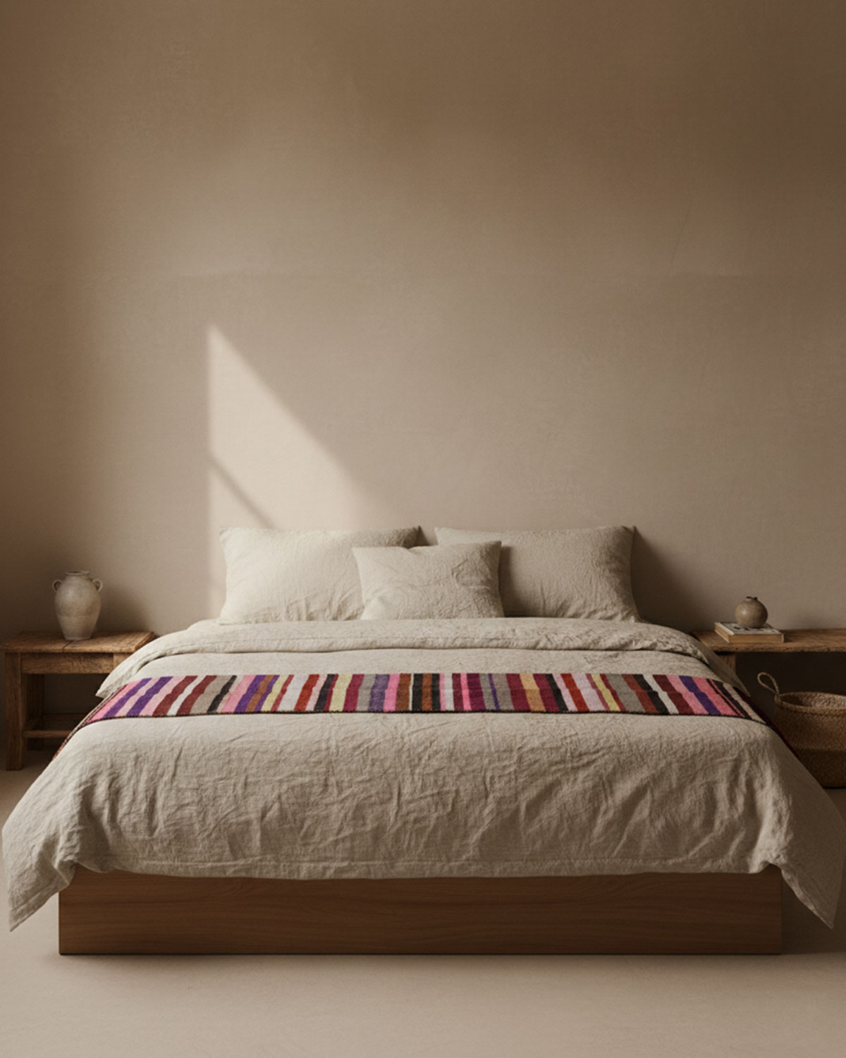 Chemin de table ou de lit en coton, fil recylé, tissé à la main avec une multitude de couleurs, parfait pour habiller une table ou sublimer un lit.