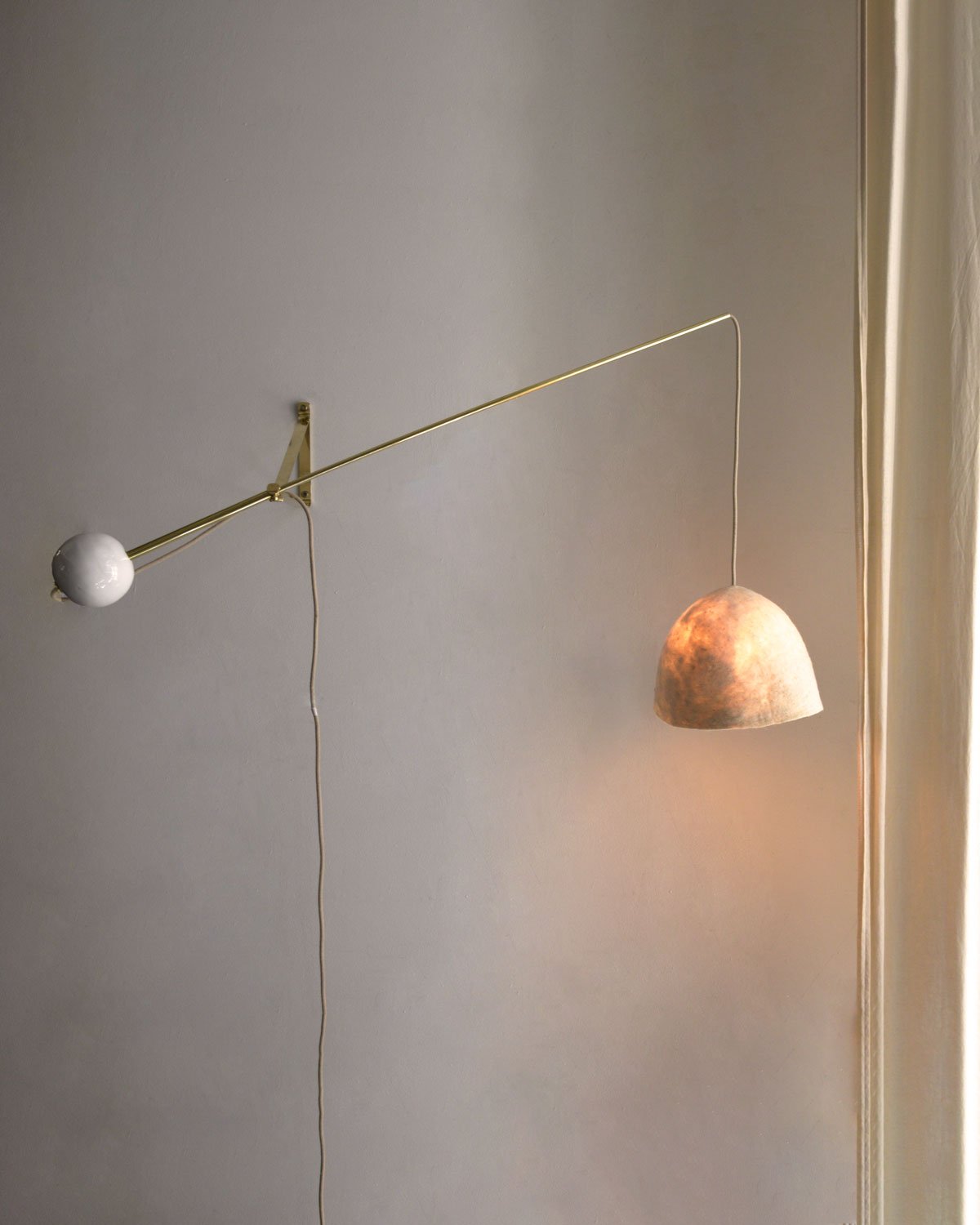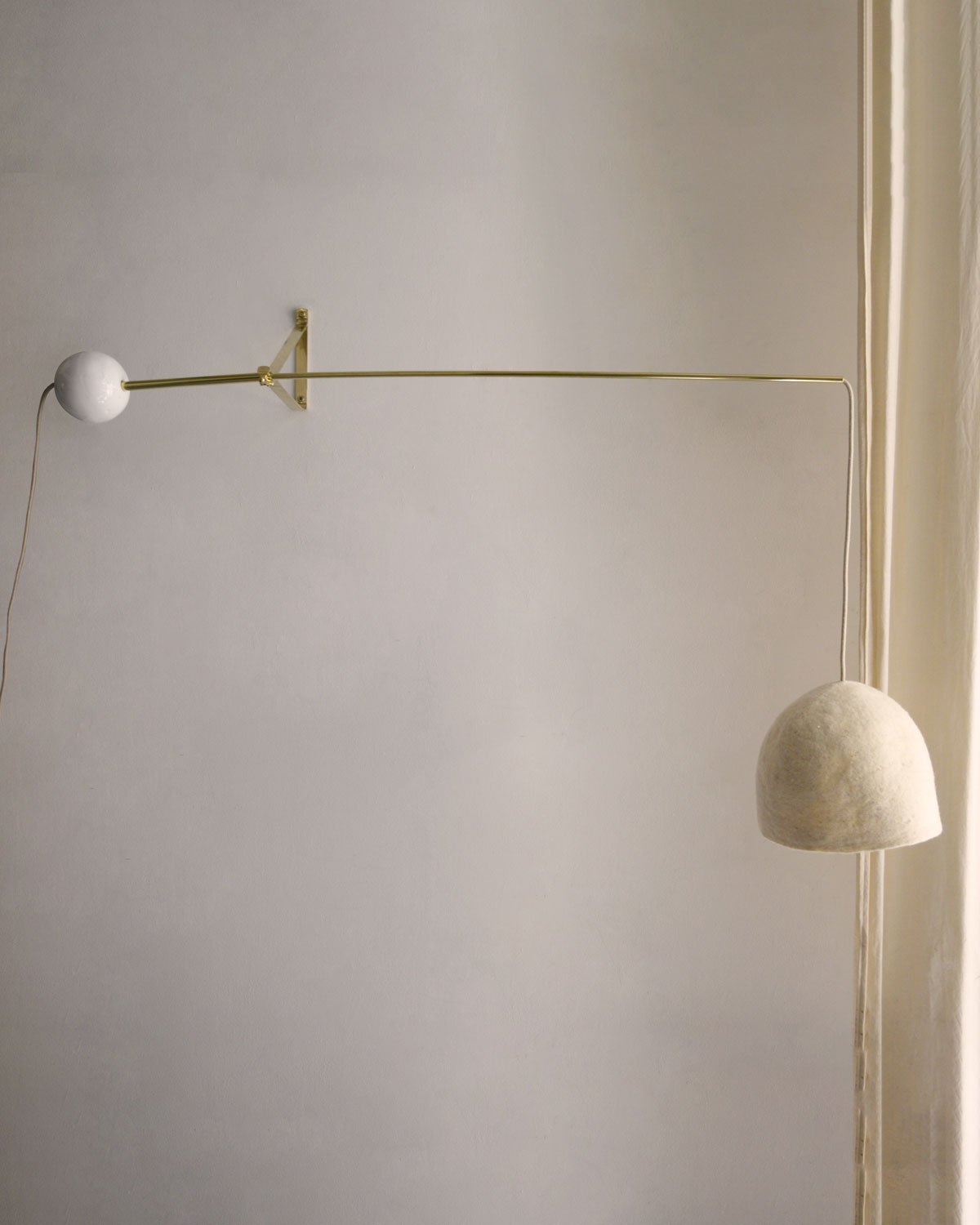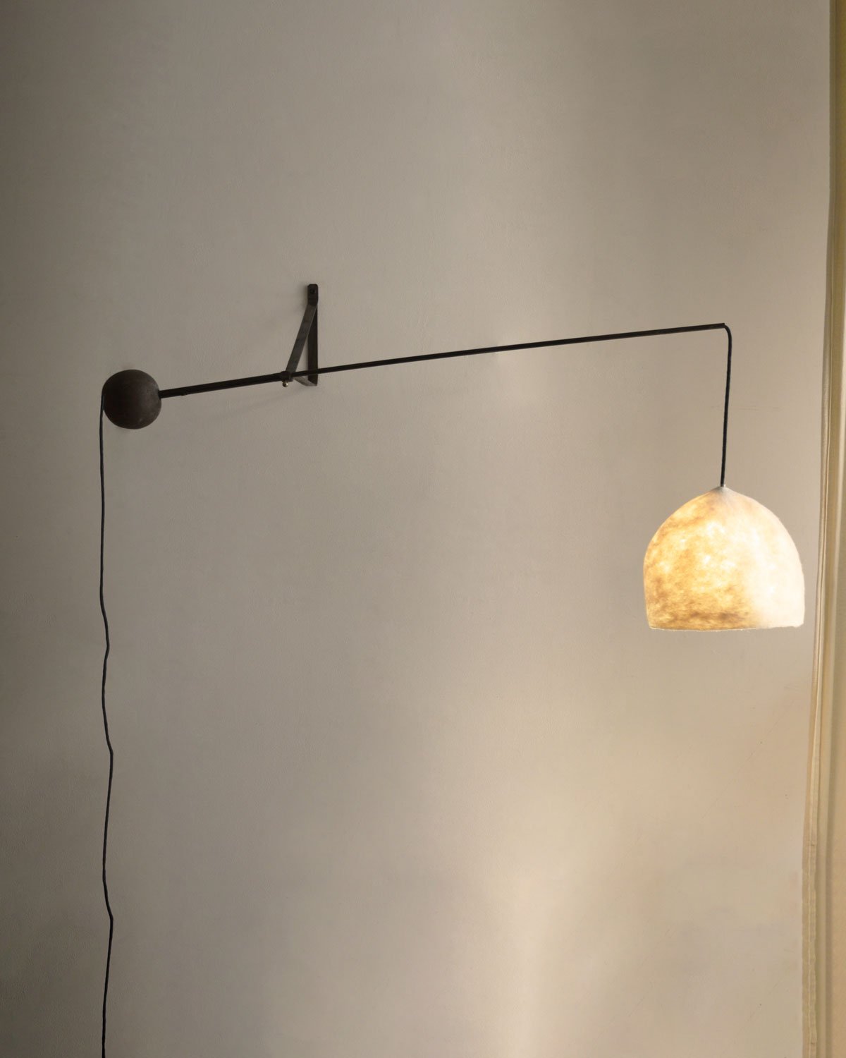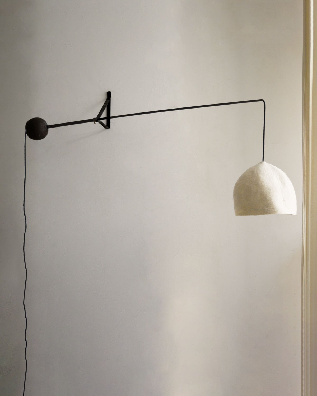 Elle est associée à un abat-jour en feutre de laine, façonné à la main, qui diffuse une lumière douce et homogène.